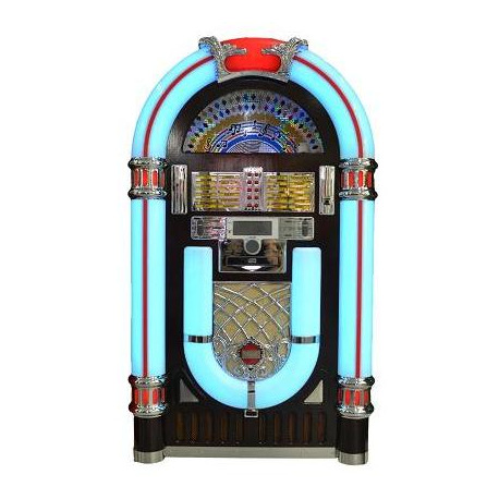 Claro que si no tenéis espacio (o presupuesto) para semejante aparato puedes optar por la versión reducida de sobremesa, esta jukebox también es chulísima, la podrás integrar más fácilmente en vuestra casa, también es muy completa e incluye, radio, cd, mp3 y USB y tarjeta SD. El acabado es el mismo que el de la versión grande, madera y luces de neón que van cambiando de color aleatoriamente.