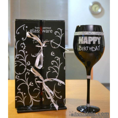 La copa de cumpleaños "Happy Birthday" es de lo más kirsch, es de cristal negro con incrustaciones brillantes y su presentación es espectacular en una elegante caja negra de cartón rígido con decoración plateada, el interior incluye forro rojo y cierre de lazo. Por si fuera poco, se puede personalizar grabando un nombre en el cristal, perfecto para que no quede lugar a dudas de quién es el /la homenajead@.